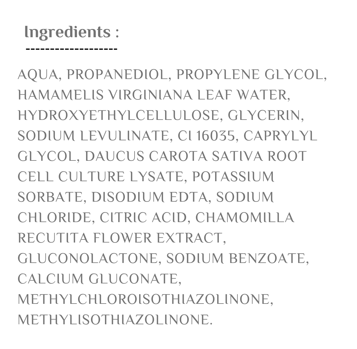سيروم لطيف للبشرة الحساسة، يحتوي على مكونات مرطبة ومُهدئة تساعد البشرة الحساسة على الشعور بالراحة والاسترخاء. قوامه خفيفٌ للغاية وغير مُزعج، تمتصُّه بشرتكِ بسرعة وسُهولة دون أيّ شُعورٍ بالثِّقل، ودون ترك أيّ بقايا دُهنيَّة على سطح بشرتكِ. تركيبته تحتوي على 1% من الخلايا الجذعية للجزر البري الذي يهدئ البشرة الحساسة ويقلل احمرارها ويرطبها بعمق، ويعزز حاجز الحماية الطبيعية فيها ومستوى تحملها، ويعمل بشكل مباشر على معالجة الالتهاب الصامت للبشرة الحساسة والجذور الحرة وأكسدة الحمض النووي، كما يعمل كمضاد لعوامل الشيخوخة مع عدم المساس بالميكروبات النافعة للبشرة. تحتوي تركيبته أيضاً على 1% من خلاصة البابونج التي تعتبر واحدة من أفضل المكونات الطبيعية للعناية بالبشرة الحساسة بسبب طبيعتها اللطيفة المهدئًة للبشرة بشكل عام، فهي تحتوي على مركبات مضادة للالتهابات والجراثيم والفطريات تساعد في تهدئة البشرة وتقليل الاحمرار والتهيج والتورم والحكة فيها، ومنع الالتهابات الجلدية التي يمكن أن تتسبب في تفاقم حالة البشرة الحساسة، وتعزز تجديد الخلايا وعملية الشفاء الطبيعية للبشرة. كما تحتوي على مكونات تساعد في الحفاظ على رطوبة البشرة ومضادات أكسدة تحمي البشرة من الأضرار الناتجة عن الجذور الحرة وتساعد في منع الشيخوخة المبكرة وتحافظ على نضارة البشرة وتألقها. مثالي للبشرة الحسَّاسة. تمَّت المُصادقة عليه من قِبل أطبَّاء الجلديَّة.