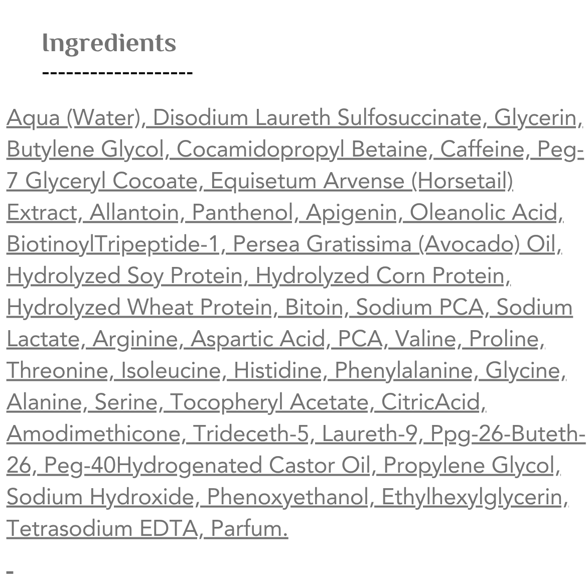 يحتوي على مكونات فعالة مثل مستخلص ذيل الحصان، مجمع الأحماض الأمينية، الكافيين، البيوتين، وبروتينات الذرة والقمح وفول الصويا المتحللة، والتي تعمل معًا لدعم بنية الشعر الأساسية، تقوية البصيلات، وتحفيز نمو شعر صحي وقوي.