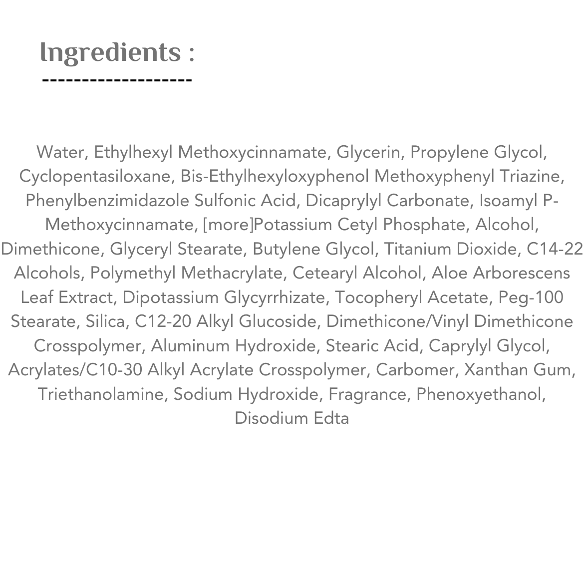 كريم واقي الشمس اليومي المستخلص من خلاصة الألوفيرا ، قوامه كريمي خفيف على البشرة و يهدئ البشرة و يرطبها ، يحجب أشعة فوق البنفسجيةو يقوم بتهدئة البشرة المتهيجة. لا يترك اثر ابيض .