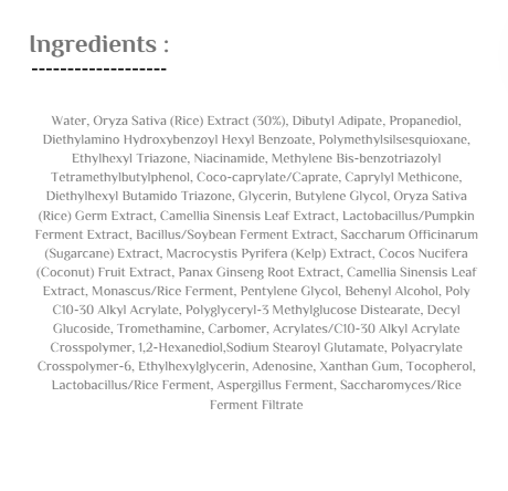 حتى عند وضع كمية كبيرة عدة مرات، فإنه لا يترك ملمسًا لزجًا، بل يمنح البشرة ترطيبًا مثل كريم مرطب خفيف. يحتوي على 30% من مستخلص الأرز ومستخلصات الحبوب المخمرة التي توفر ترطيبًا وتغذية للبشرة.