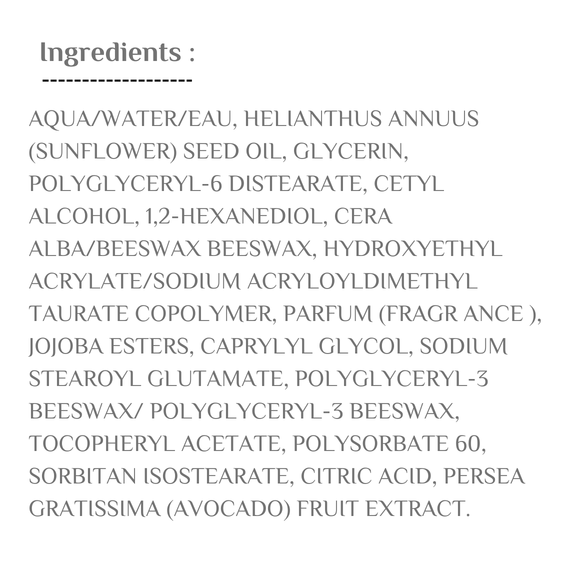 المكونات الاساسية:زيت دوار الشمس, فيتامين اي, غليسيرين نباتي, افوكادو